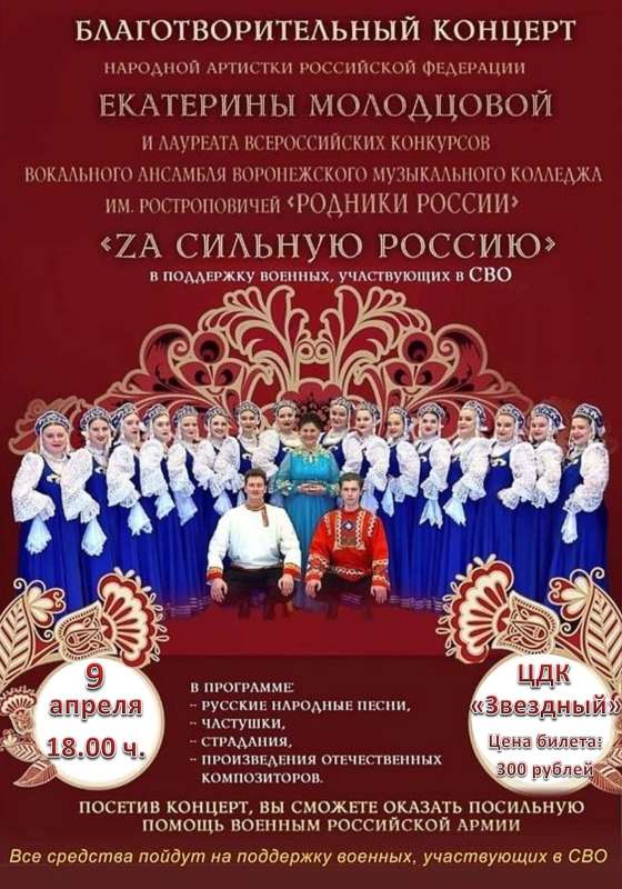 Благотворительный концерт9 апреля 2024 года в 18.00 часов в ЦДК «Звездный» состоится
