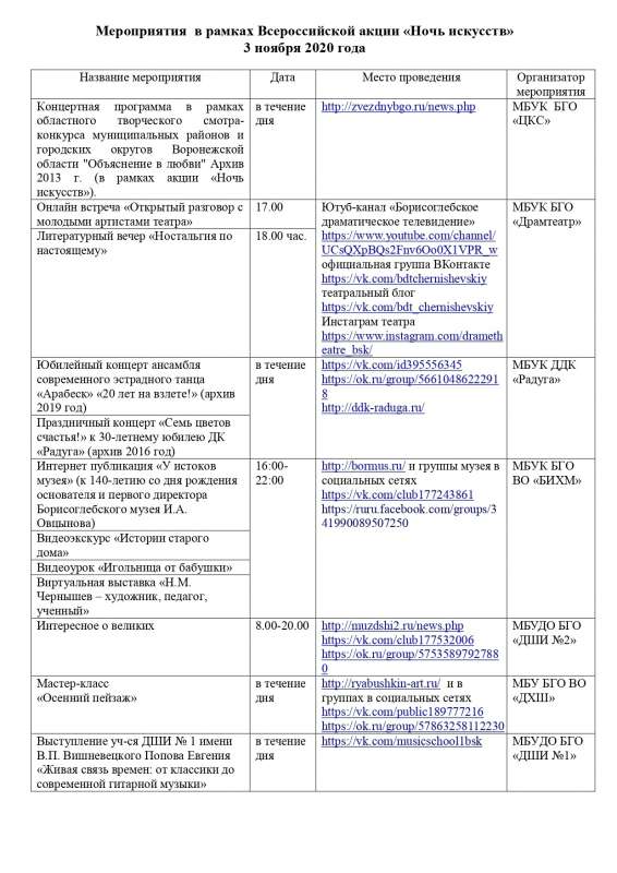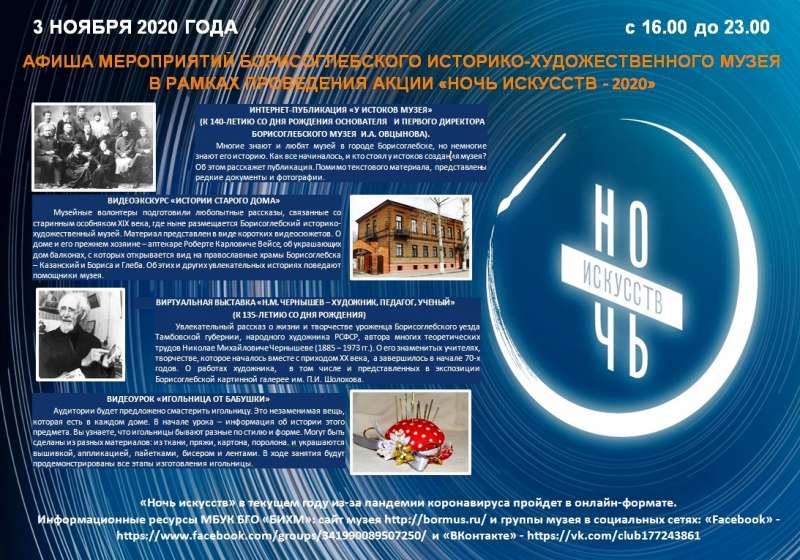 Учреждения культуры Борисоглебска традиционно присоединяются ко Всероссийской акции "Ночь искусств". Приглашаем принять участие в мероприятиях акции.