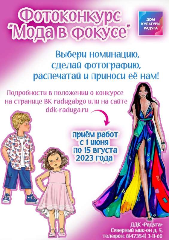 Национальный традиционный костюм, отражающий особенности культуры и истории народов России или мира. Приём работ с 1 июня по 15 августа. Для участия необходимо принести свою распечатанную фотографию А4 и заявку (находится в положении о конкурсе) по адресу Северный микрорайон дом 5. Положение фотоконкурса "Мода в фокусе-2023"