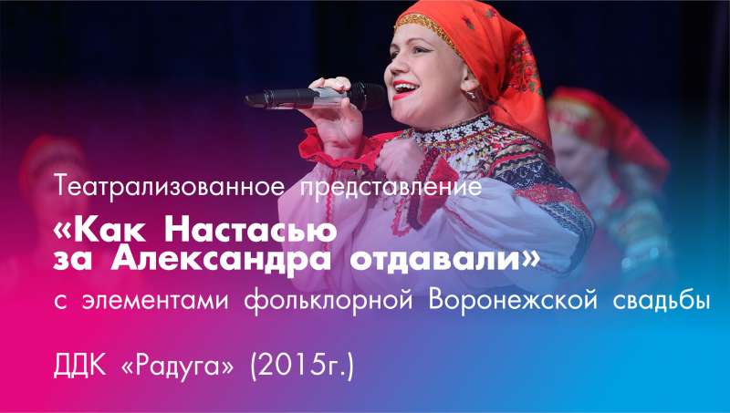 «Как Настасью за Александра отдавали»Не отступая от обычаев старины с добавлением современных музыкальных аранжировок, солисты народной вокальной студии «Акцент» Детского дома культуры «Радуга» предлагают вашему вниманию фольклорную музыкальную зарисовку «Как Настасью за Александра выдавали» по мотивам традиционных свадебных обрядов Воронежской области.
