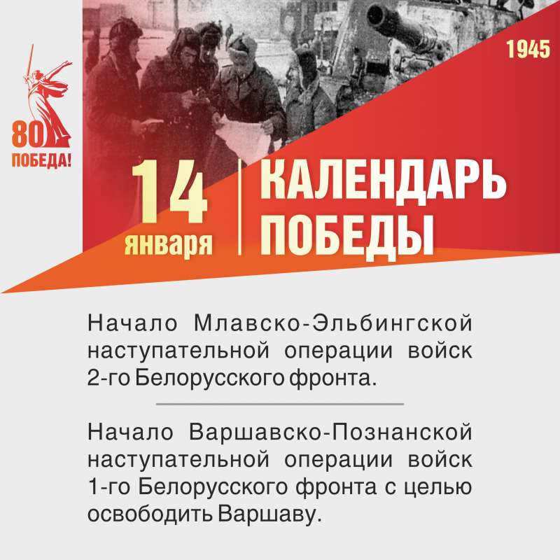 Календарь победы - 14 январяСегодня мы начинаем новую онлайн-рубрику "Календарь победы", приуроченную к 80-летию Победы в Великой Отечественной войне.Мы будем регулярно публиковать даты ключевых сражений и короткую фронтовую сводку за 1945 год вплоть до штурма Берлина.