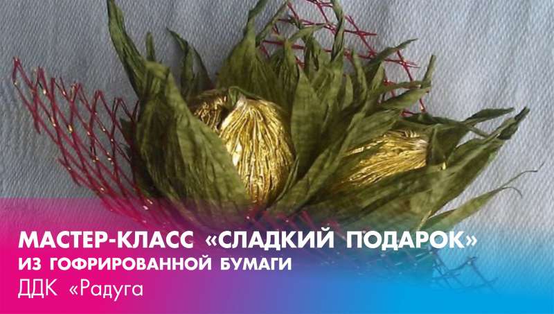 Мастер-класс «Сладкий подарок» из гофрированной бумаги.Руководитель прикладного кружка «Сувенир» МБУК ДДК "Радуга" Тарасова Елена Геннадьевна провела онлайн-мастер-класс "Сладкий подарок". Для изготовления работы нам потребуются: гофрированная бумага золотого и зеленого цветов, тейп-лента, скотч, фоамиран, нитки швейные, капроновая сетка, восковые мелки, три конфеты (круглые), три зубочистки, заготовка листика, ножницы. Из зеленой бумаги вырезаем листики, а в золотую-закручиваем конфеты, закрепляем тейп-лентой. Собираем все элементы вместе.Подарок готов!