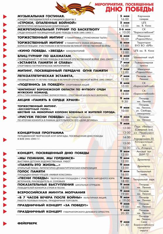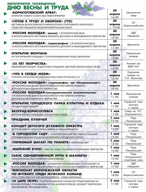 Грядут майские праздники, насыщенные различными мероприятиями. Все праздничные события объедены в два тематических раздела: "МЕРОПРИЯТИЯ, ПОСВЯЩЕННЫЕ ДНЮ ВЕСНЫ И ТРУДА" и "МЕРОПРИЯТИЯ, ПОСВЯЩЕННЫЕ ДНЮ ПОБЕДЫ".