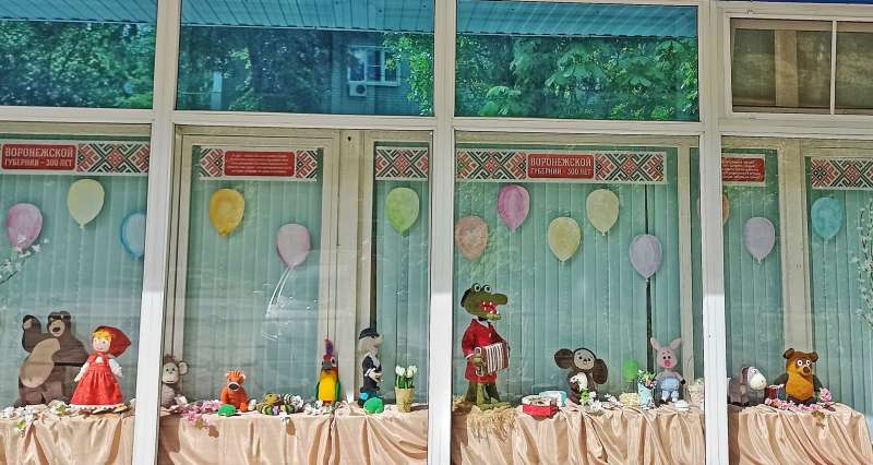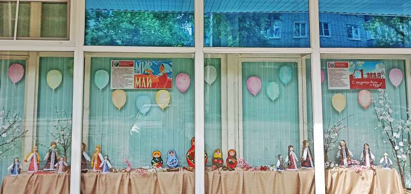 В панорамных окнах ДК "Радуга" экспонируется праздничная майская выставка.