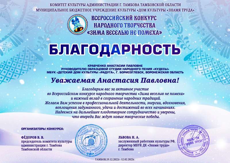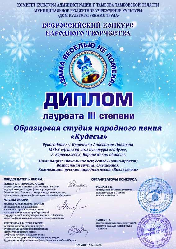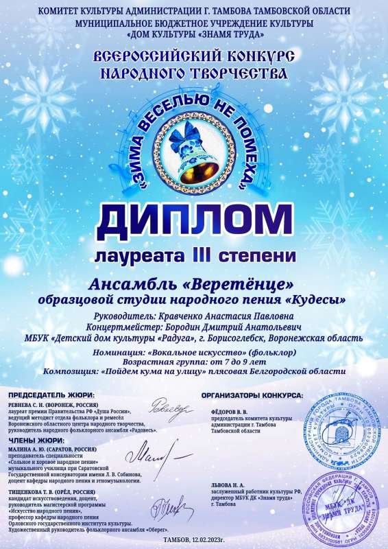 Всероссийский конкурсе "Зима веселью не помеха" (г. Тамбов) - дипломы лауреатов lll степени.