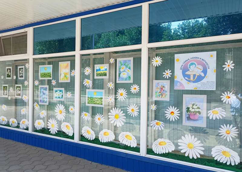 В панорамных окнах ДК "Радуга" представлены разнообразные работы, выполненные в разных техниках и стилях, отражающие красоту и нежность этого скромного, но такого любимого многими цветка.