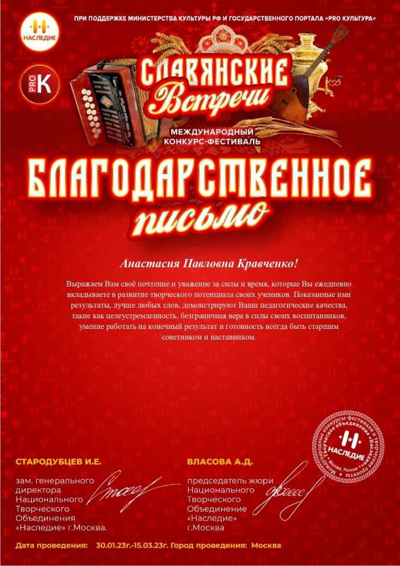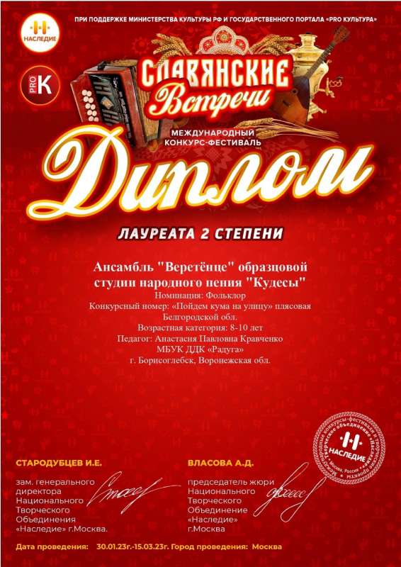 Международный конкурс-фестиваль "Славянские встречи" (г. Москва) - дипломы лауреатов II степени.