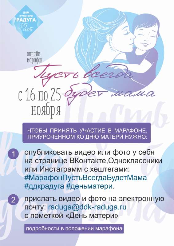 а так же необходимо прислать видео и фото на электронную почту: raduga@ddk-raduga.ru с пометкой «День матери».