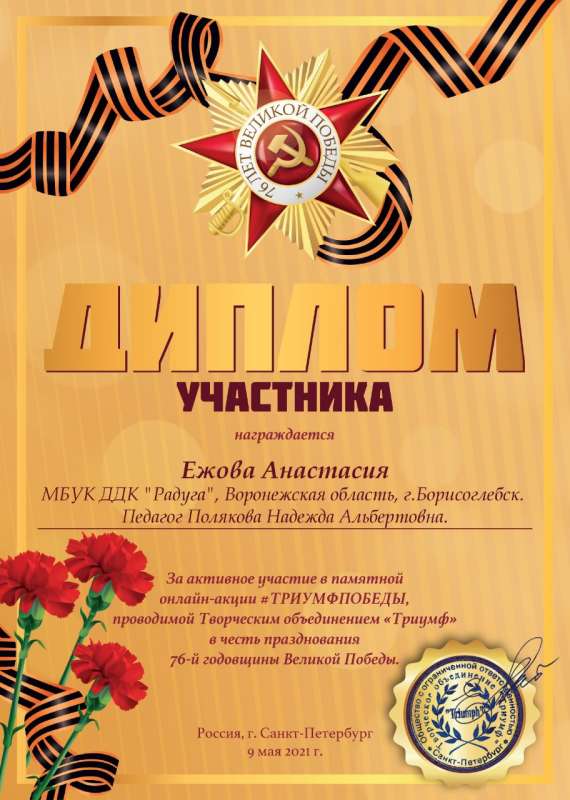Анастасия Ежова стала участницей онлайн-акции #ТРИУМФПОБЕДЫ и получила подарочный сертификат на участие в I Международном конкурсе музыкально-художественного творчества "Голоса Победы. Новосибирск"