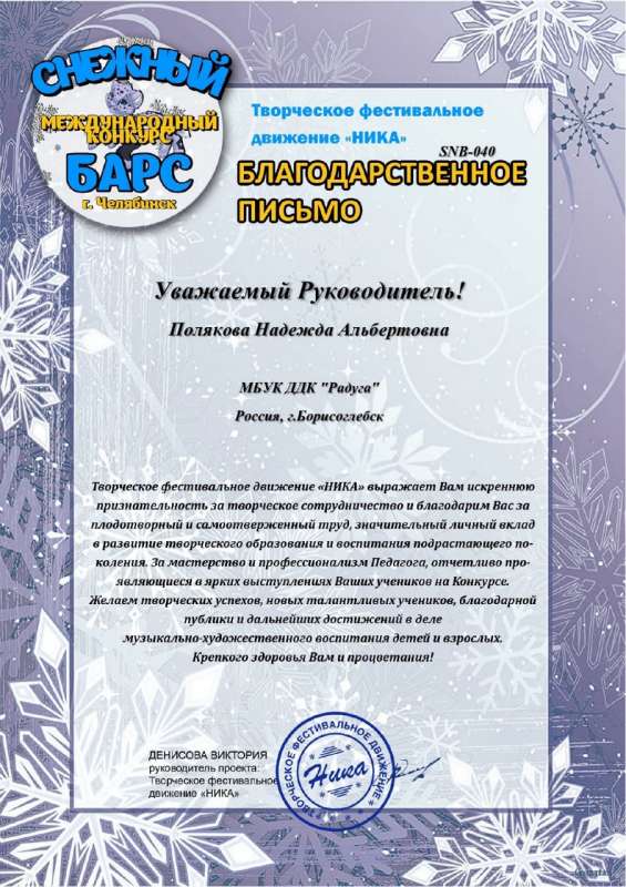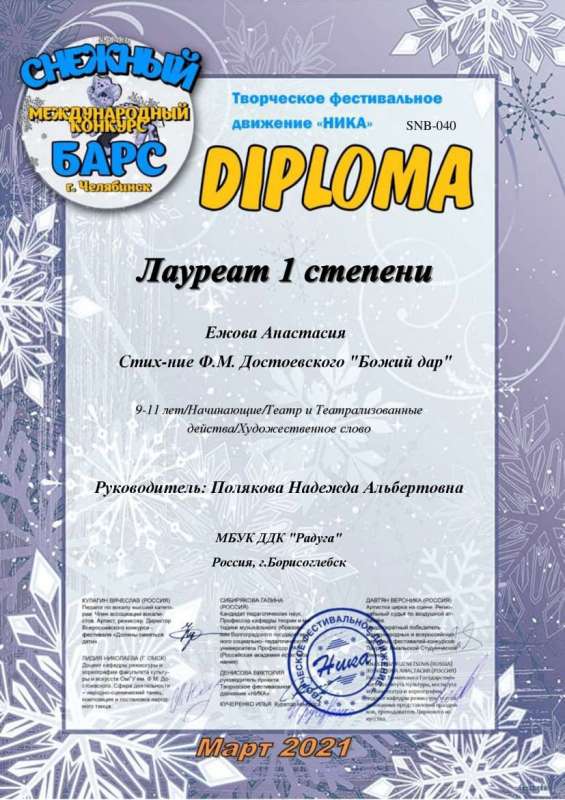Поздравляем Анастасию Ежову с победой в Международном конкурсе творчества и таланта «СНЕЖНЫЙ БАРС»