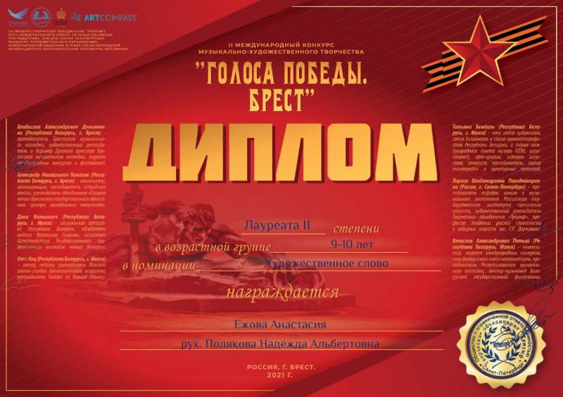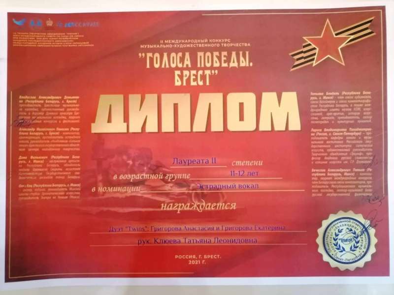 II Международны конкурс "Голоса Победы.Брест"Дуэт "Twins" Екатерина и Анастасия Григоровы (образцовой вокальной студии "Поющий город" рук. Клюева Татьяна Леонидовна) и Анастасия Ежова (участница танцевального ансамбля "Непоседы" рук. Полякова Надежда Альбертовна) приняли участие во II международном конкурсе музыкально-художественного творчества "Голоса Победы.Брест" и стали Лауреатами 2 степени в номинациях эстрадный вокал и художественное слово.