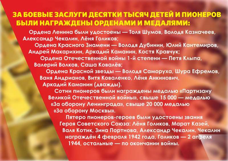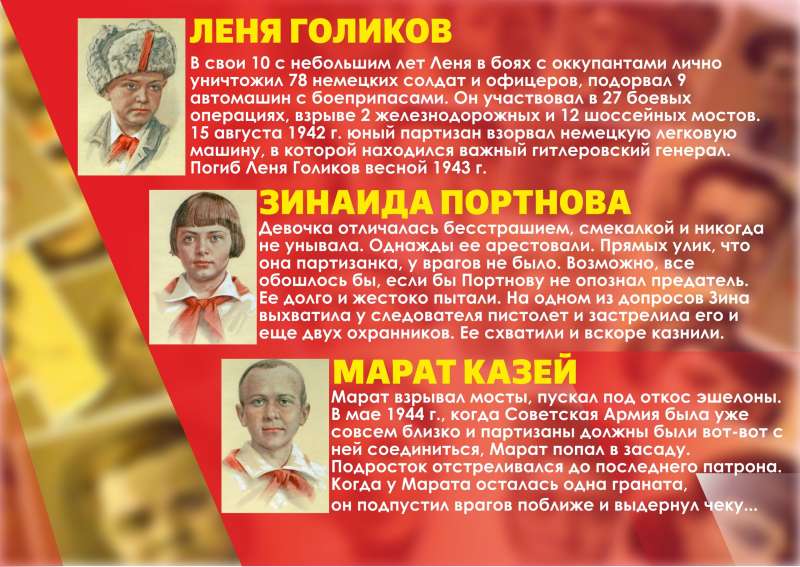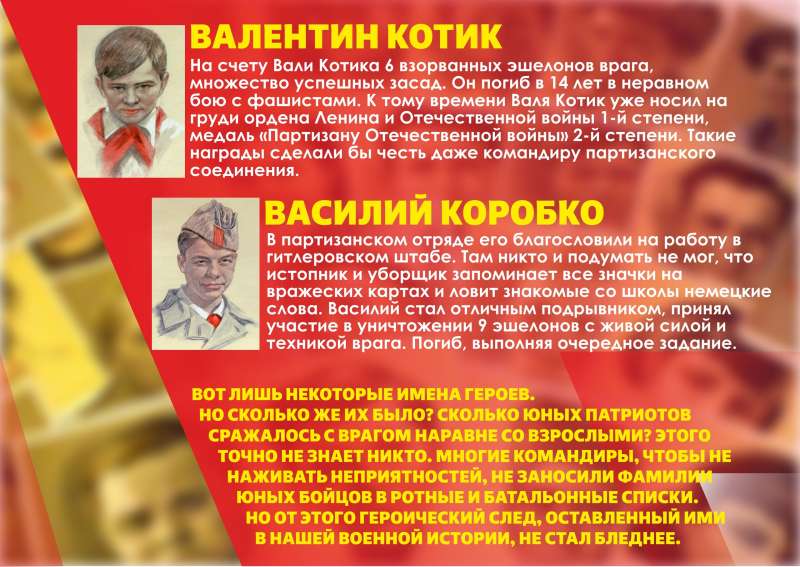 Информационная выставка "Герои-пионеры"В этой инфовыставке вы узнаете имена лишь некоторых героев. Но сколько же их было? Сколько юных патриотов сражали с врагом наравне со взрослыми? Этого точно не знает никто. Многие командиры, чтобы не наживать неприятностей, не заносили фамилии юных бойцов в ротные и батальонные списки. Но от этого героический след, оставленный ими в нашей военной истории, не стал бледнее.